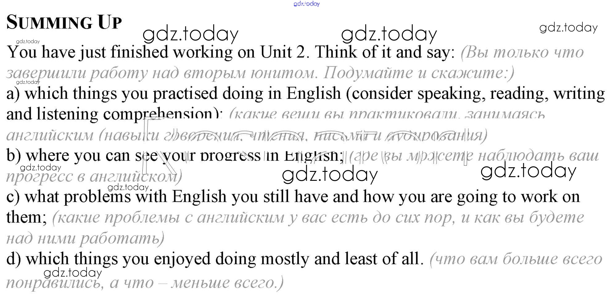 На страницах сайта gdz.today вы найдете учебный и вспомогательный материал, направленный на улучшения знаний школьной программы. ГДЗ - онлайн мир знаний Решение к Unit 2 Summing Up Учебнику по Английскому языку для 8 класса Афанасьева, Михеева Углубленный уровень Просвещение 2014