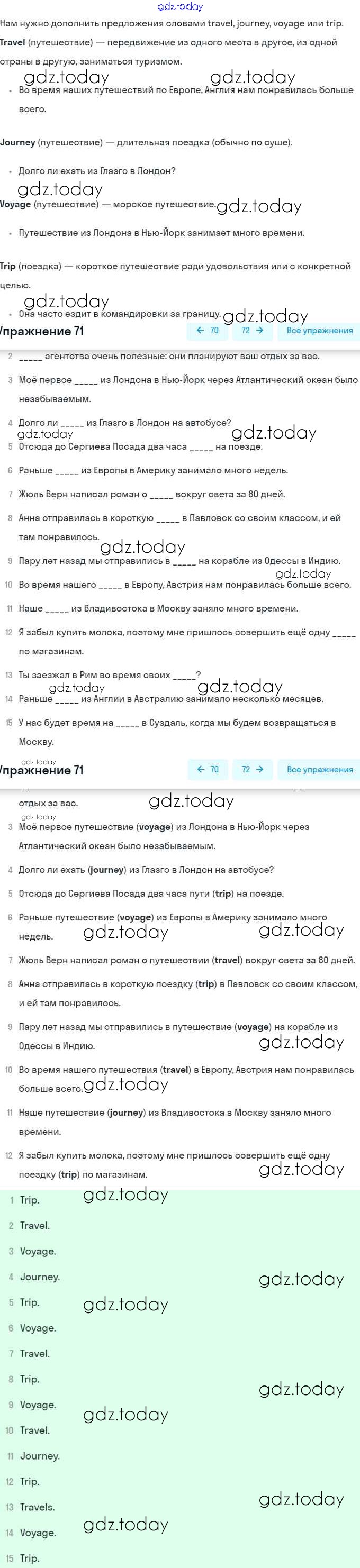 На страницах сайта gdz.today вы найдете учебный и вспомогательный материал, направленный на улучшения знаний школьной программы. ГДЗ - онлайн мир знаний Решение. Unit 5. Going to Places: The World of Travelling 71 Учебнику по Английскому языку для 8 класса Афанасьева, Михеева Углубленный уровень Просвещение 2014