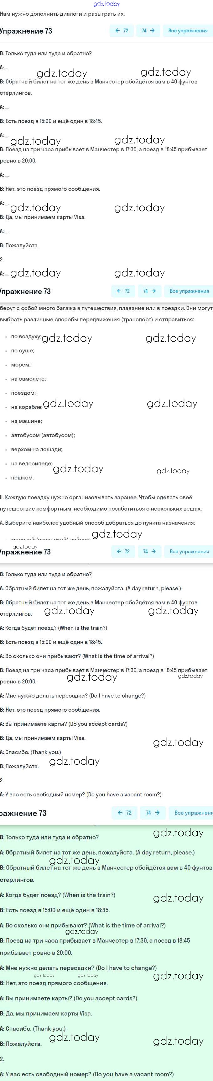 На страницах сайта gdz.today вы найдете учебный и вспомогательный материал, направленный на улучшения знаний школьной программы. ГДЗ - онлайн мир знаний Решение. Unit 5. Going to Places: The World of Travelling 73 Учебнику по Английскому языку для 8 класса Афанасьева, Михеева Углубленный уровень Просвещение 2014