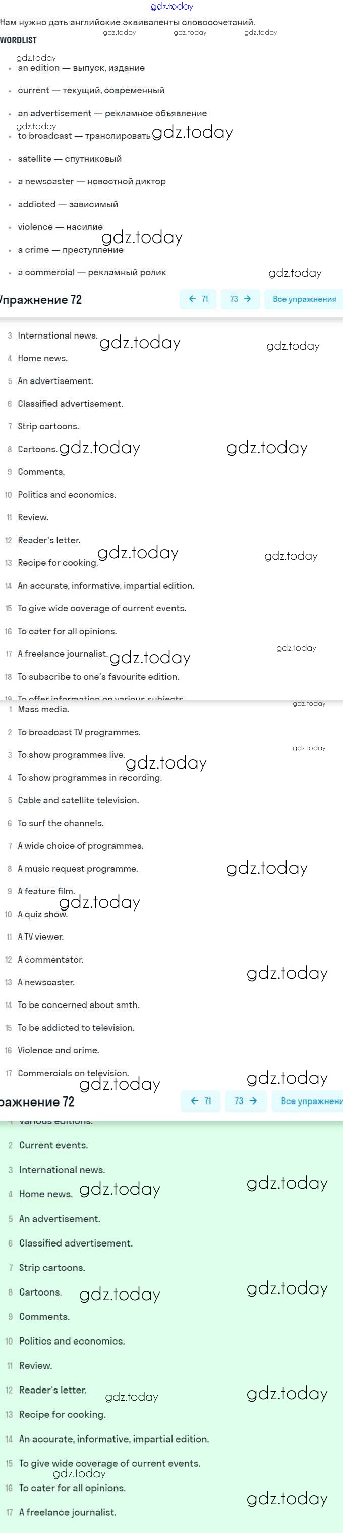 На страницах сайта gdz.today вы найдете учебный и вспомогательный материал, направленный на улучшения знаний школьной программы. ГДЗ - онлайн мир знаний Решение. Unit 6. Newspapers and Television: The World of Mass Media 72 Учебнику по Английскому языку для 8 класса Афанасьева, Михеева Углубленный уровень Просвещение 2014