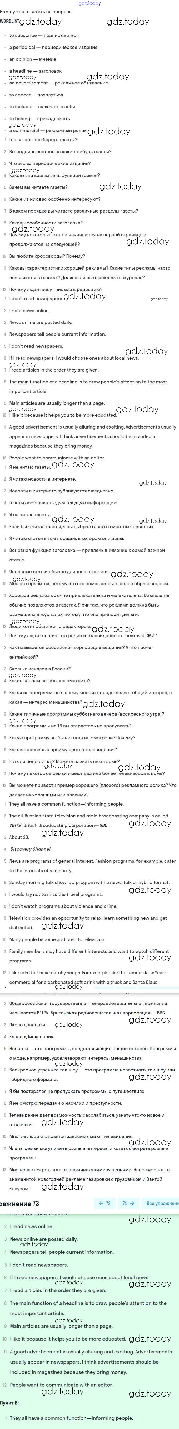 На страницах сайта gdz.today вы найдете учебный и вспомогательный материал, направленный на улучшения знаний школьной программы. ГДЗ - онлайн мир знаний Решение. Unit 6. Newspapers and Television: The World of Mass Media 73 Учебнику по Английскому языку для 8 класса Афанасьева, Михеева Углубленный уровень Просвещение 2014