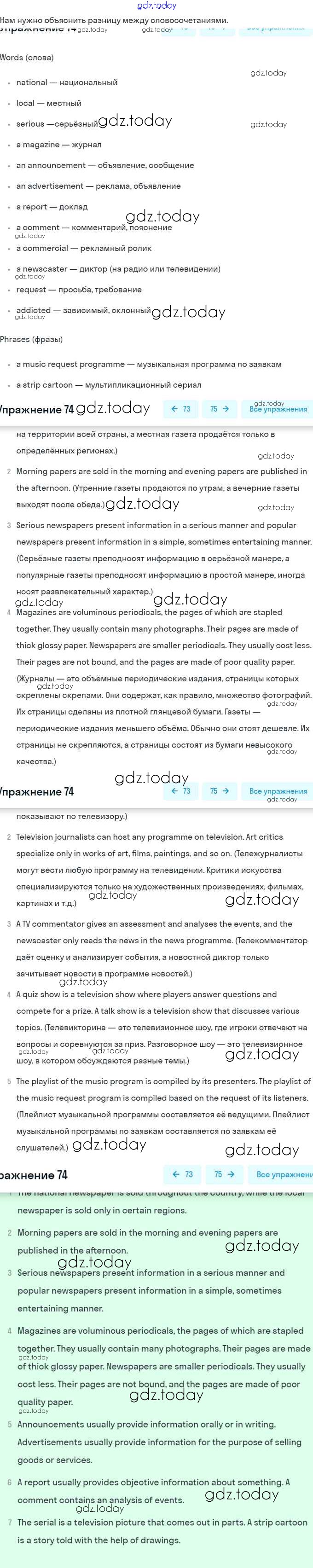 На страницах сайта gdz.today вы найдете учебный и вспомогательный материал, направленный на улучшения знаний школьной программы. ГДЗ - онлайн мир знаний Решение. Unit 6. Newspapers and Television: The World of Mass Media 74 Учебнику по Английскому языку для 8 класса Афанасьева, Михеева Углубленный уровень Просвещение 2014
