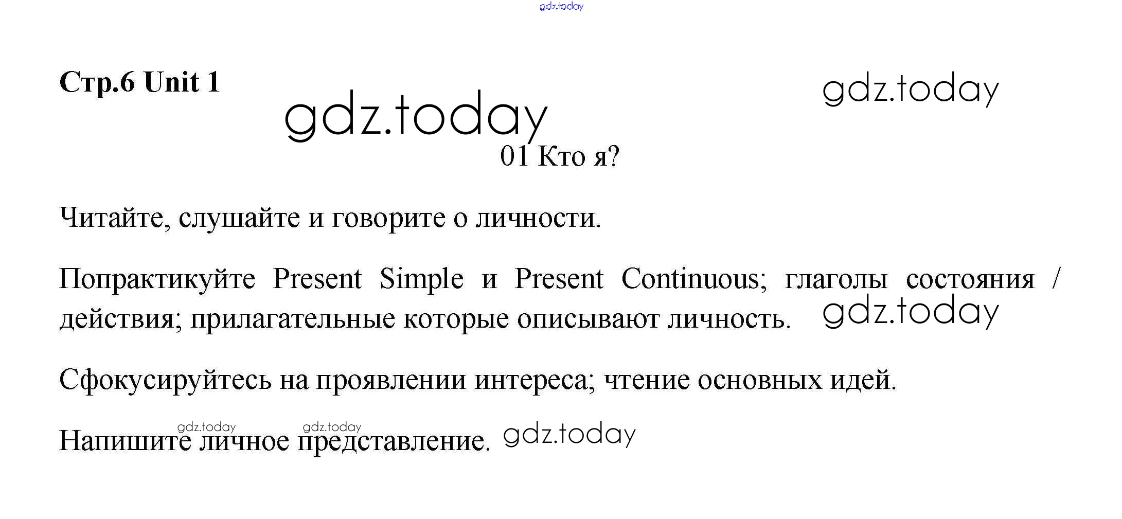 На страницах сайта gdz.today вы найдете учебный и вспомогательный материал, направленный на улучшения знаний школьной программы. ГДЗ - онлайн мир знаний Решение. Unit 1 Who am I? стр.6 Учебнику по Английскому языку для 8 класса Вербицкая, Маккинли Вентана-граф Forward 2016