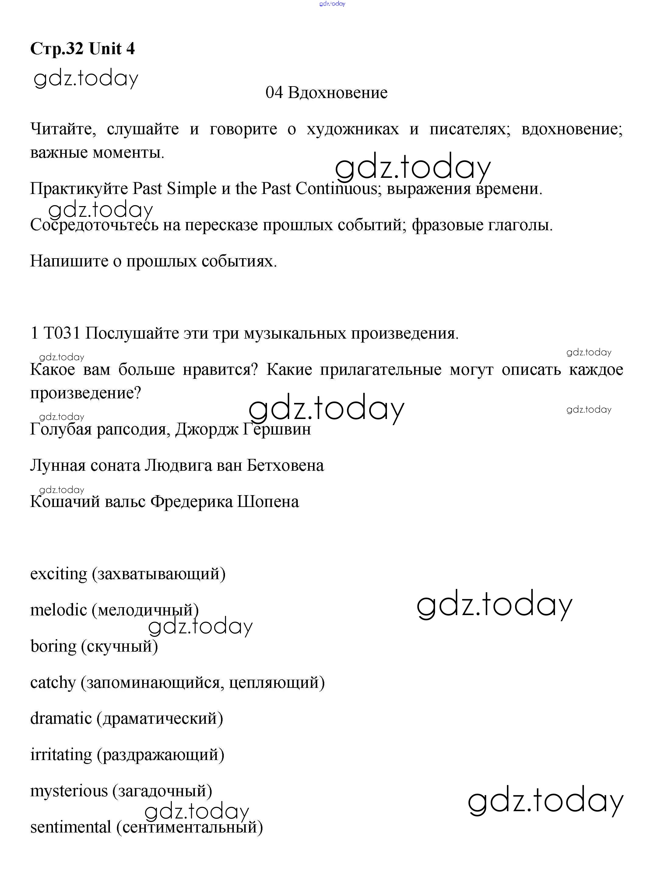 На страницах сайта gdz.today вы найдете учебный и вспомогательный материал, направленный на улучшения знаний школьной программы. ГДЗ - онлайн мир знаний Решение. Unit 4 Inspiration стр.32 Учебнику по Английскому языку для 8 класса Вербицкая, Маккинли Вентана-граф Forward 2016