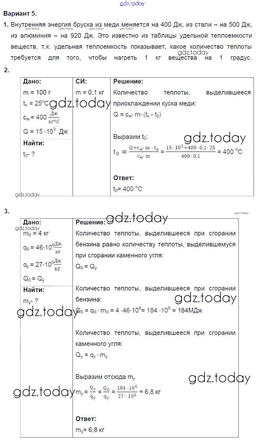 Ответы к СР №3. Количество теплоты. Энергия топлива. Варианты Решение к самостоятельным работам 5 Дидактическим материалам по Физике для 8 класса Марон Дрофа Вертикаль 2016