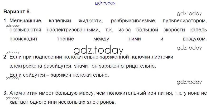 На страницах сайта gdz.today вы найдете учебный и вспомогательный материал, направленный на улучшения знаний школьной программы. ГДЗ - онлайн мир знаний СР №6. Электризация тел. Электрическое поле. Строение атома. Варианты Решение к самостоятельным работам 6 Дидактическим материалам по Физике для 8 класса Марон Дрофа Вертикаль 2016