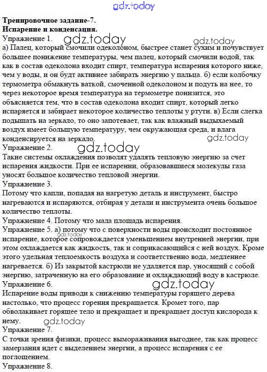 На страницах сайта gdz.today вы найдете учебный и вспомогательный материал, направленный на улучшения знаний школьной программы. ГДЗ - онлайн мир знаний Решение к тренировочным заданиям 7. Испарение и конденсация Дидактическим материалам по Физике для 8 класса Марон Дрофа Вертикаль 2016