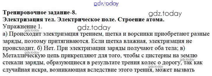На страницах сайта gdz.today вы найдете учебный и вспомогательный материал, направленный на улучшения знаний школьной программы. ГДЗ - онлайн мир знаний Решение к тренировочным заданиям 8. Электризация тел. Электрическое поле. Строение атомов Дидактическим материалам по Физике для 8 класса Марон Дрофа Вертикаль 2016