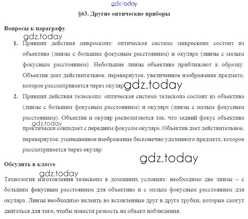 На страницах сайта gdz.today вы найдете учебный и вспомогательный материал, направленный на улучшения знаний школьной программы. ГДЗ - онлайн мир знаний Решение к параграфам § 63. Другие оптические приборы Учебнику по Физике для 8 класса Громов, Родина Просвещение 2018