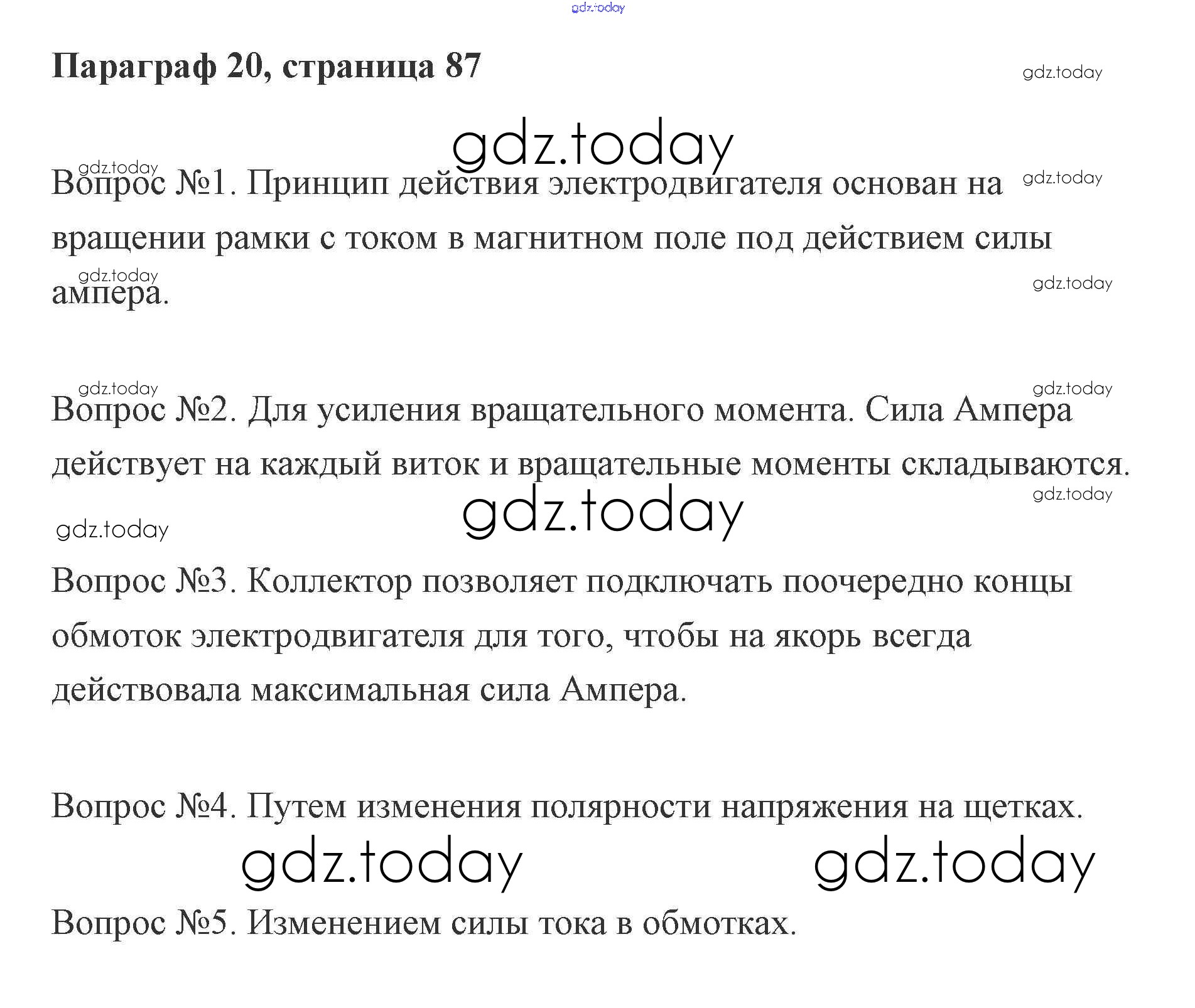 Ответы к Параграф 20 (Страницы) Решение к вопросам к параграфам (Параграфы) 87 Учебнику по Физике для 8 класса Кабардин Просвещение Архимед 2016