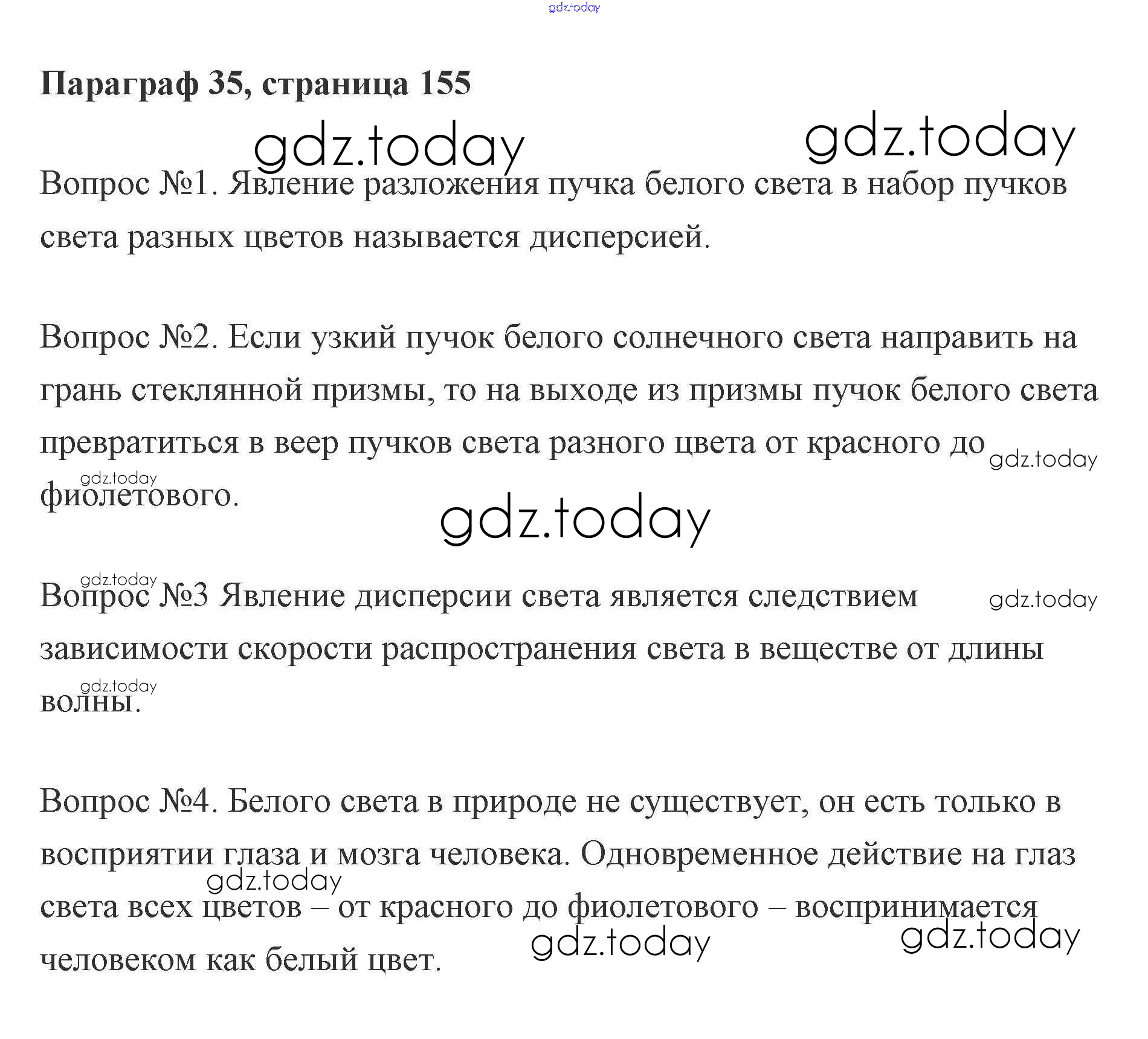 На страницах сайта gdz.today вы найдете учебный и вспомогательный материал, направленный на улучшения знаний школьной программы. ГДЗ - онлайн мир знаний Параграф 35 (Страницы) Решение к вопросам к параграфам (Параграфы) 155 Учебнику по Физике для 8 класса Кабардин Просвещение Архимед 2016