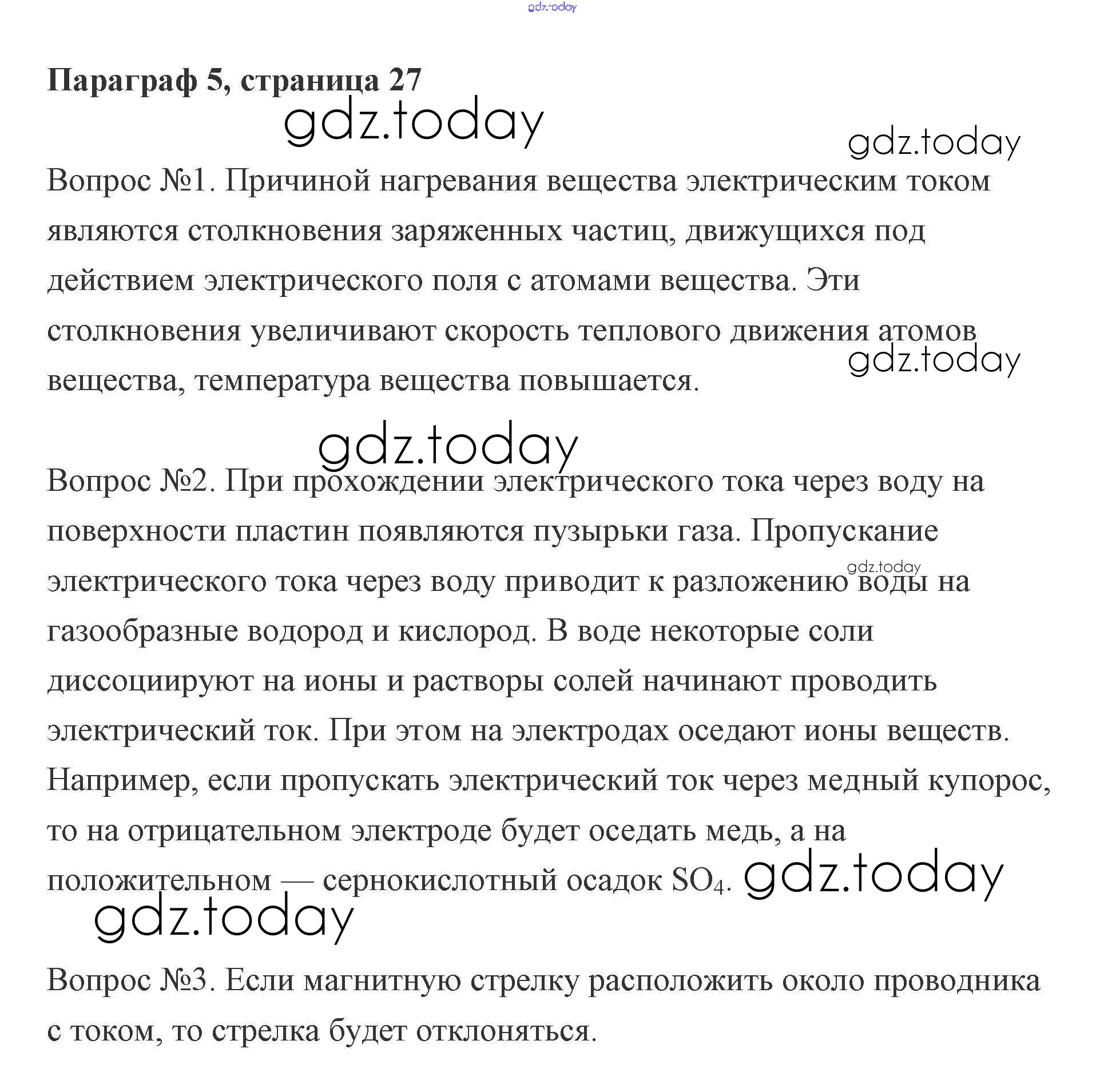 Ответы к Параграф 5 (Страницы) Решение к вопросам к параграфам (Параграфы) 27 Учебнику по Физике для 8 класса Кабардин Просвещение Архимед 2016