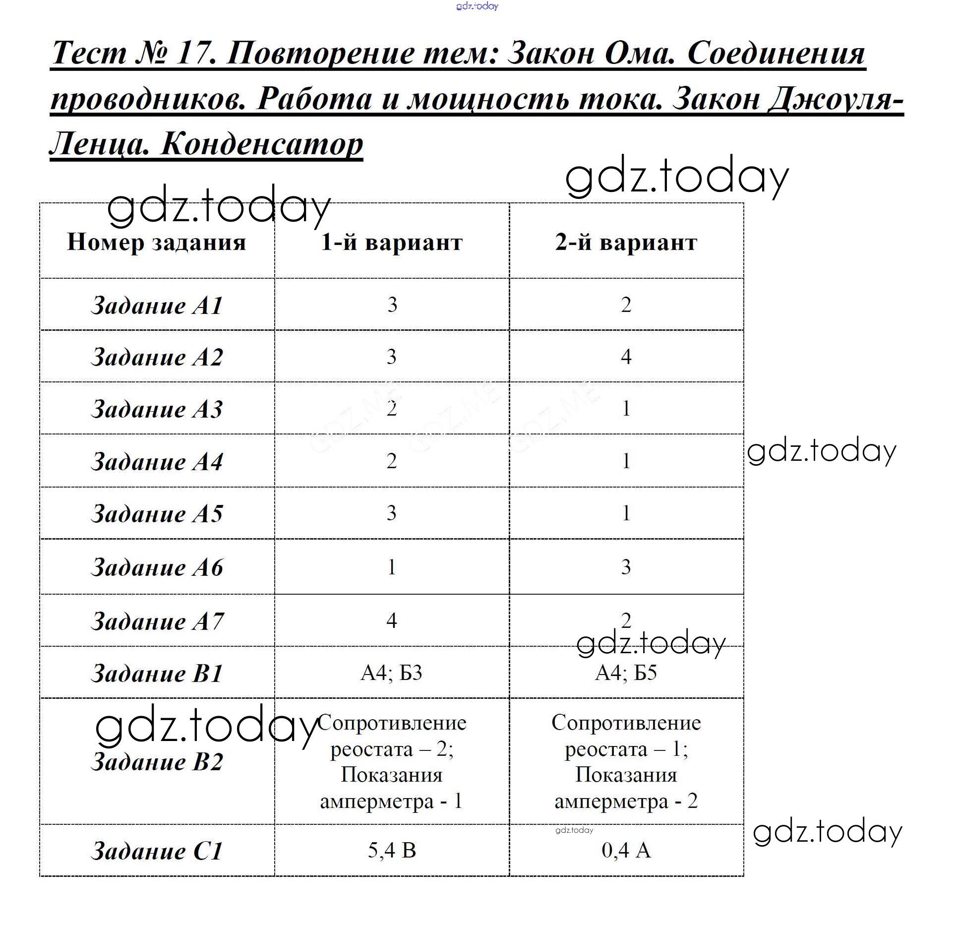Ответы к Решение к тестам Тест 17. Повторение тем - Закон Ома. Соединения проводников и др. Контрольно-измерительным материалам (КИМ) по Физике для 8 класса Бобошина Экзамен 2014