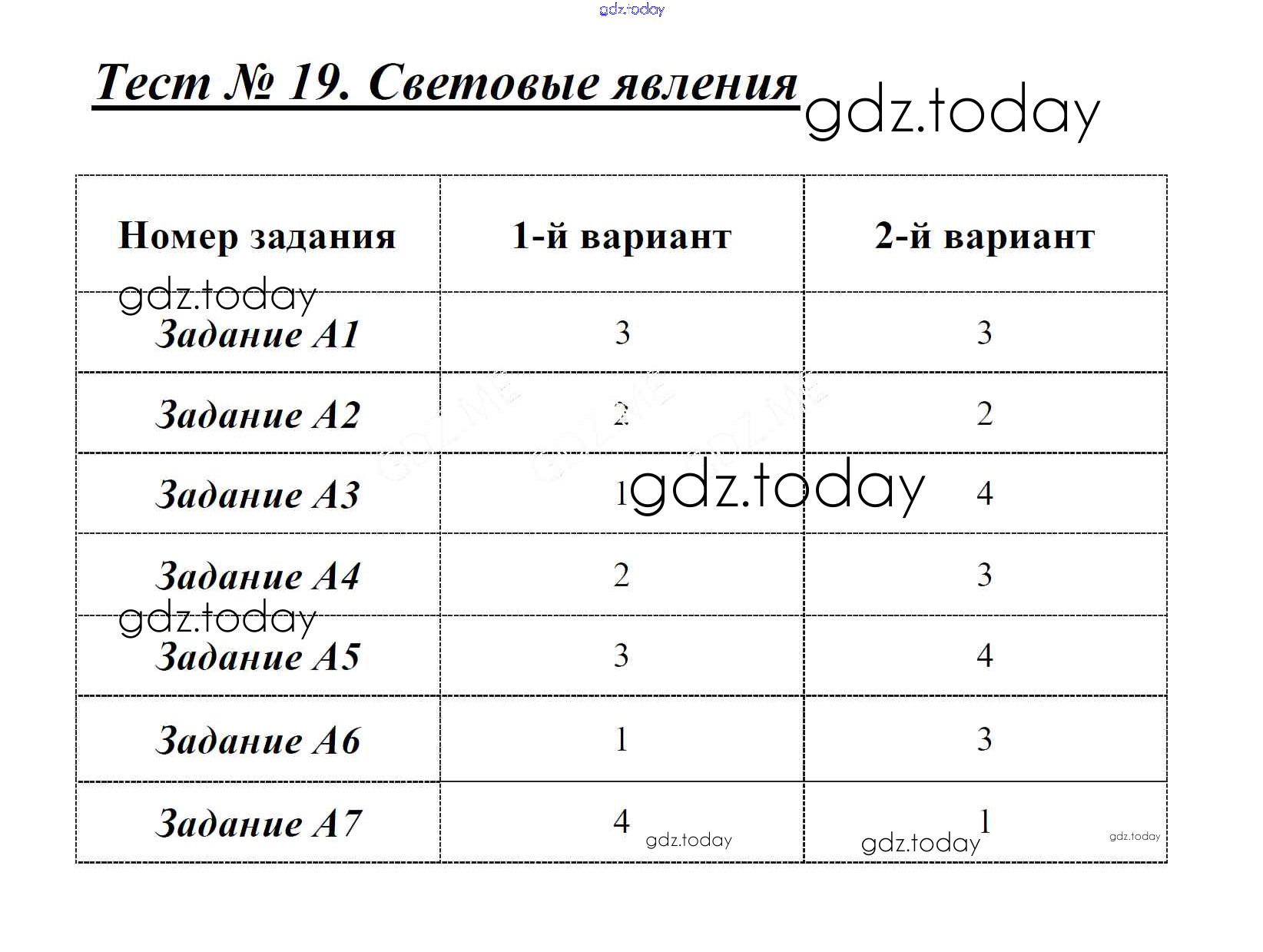 На страницах сайта gdz.today вы найдете учебный и вспомогательный материал, направленный на улучшения знаний школьной программы. ГДЗ - онлайн мир знаний Решение к тестам Тест 19. Световые явления Контрольно-измерительным материалам (КИМ) по Физике для 8 класса Бобошина Экзамен 2014