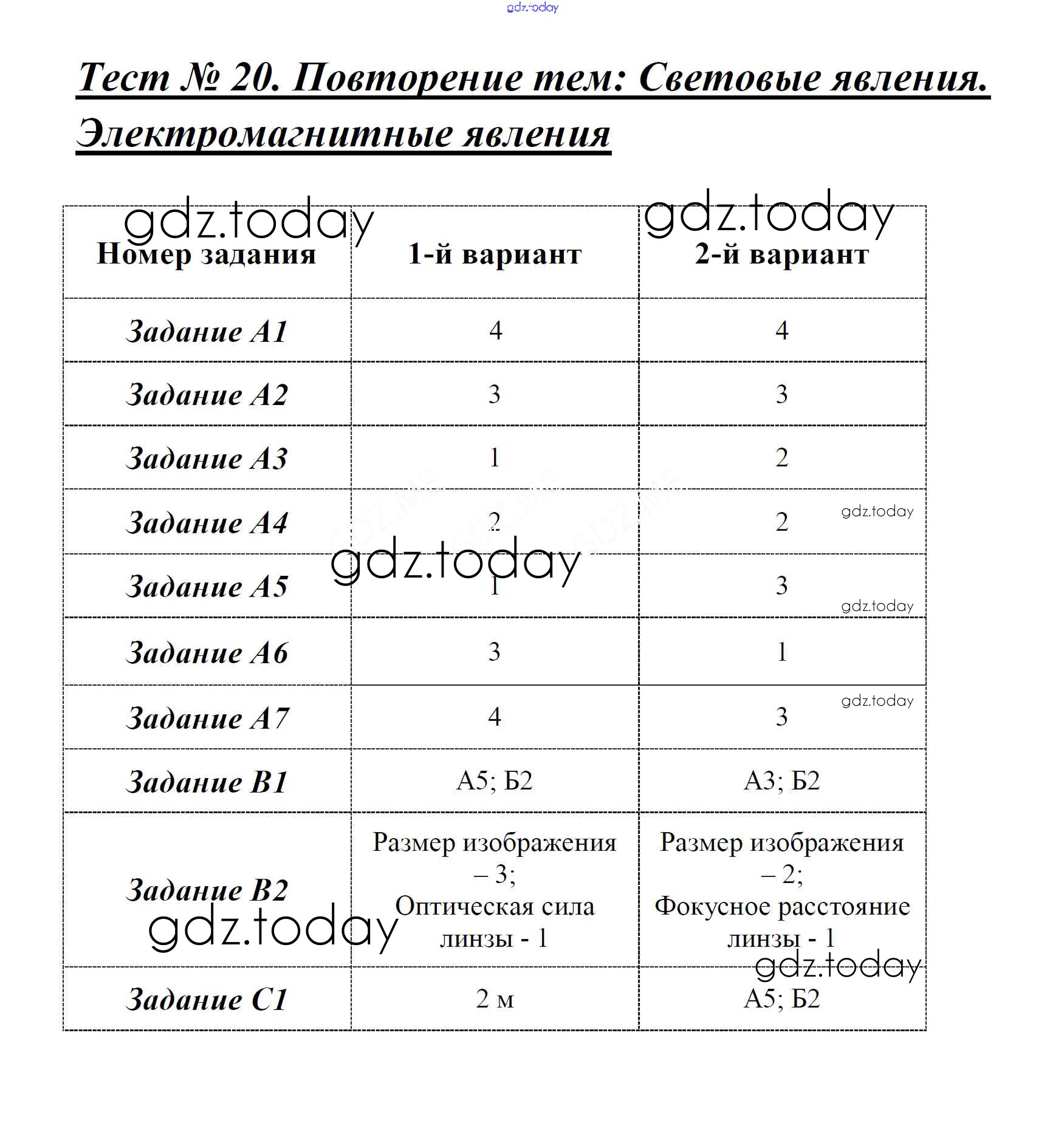 На страницах сайта gdz.today вы найдете учебный и вспомогательный материал, направленный на улучшения знаний школьной программы. ГДЗ - онлайн мир знаний Решение к тестам Тест-20. Повторение тем - Световые явления. Электромагнитные явления Контрольно-измерительным материалам (КИМ) по Физике для 8 класса Бобошина Экзамен 2014