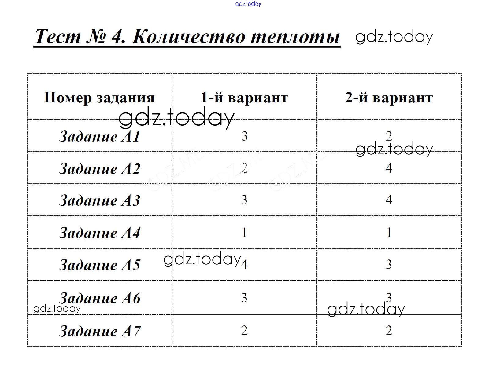 На страницах сайта gdz.today вы найдете учебный и вспомогательный материал, направленный на улучшения знаний школьной программы. ГДЗ - онлайн мир знаний Решение к тестам Тест 4. Количество теплоты Контрольно-измерительным материалам (КИМ) по Физике для 8 класса Бобошина Экзамен 2014