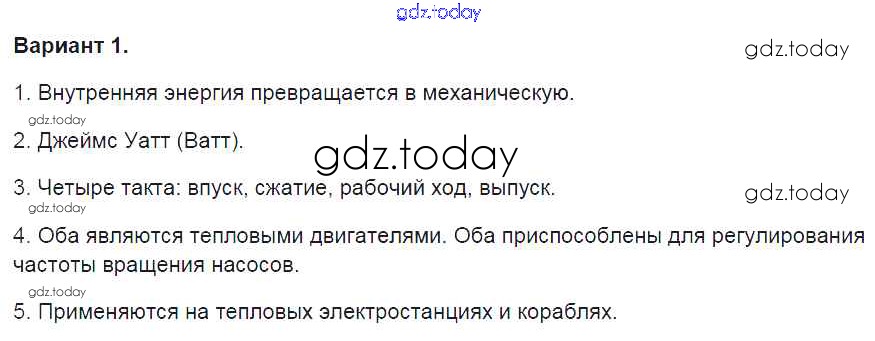 На страницах сайта gdz.today вы найдете учебный и вспомогательный материал, направленный на улучшения знаний школьной программы. ГДЗ - онлайн мир знаний СР №20. Работа газа и пара при расширении. Двигатель внутреннего сгорания. Паровая турбина Решение к самостоятельным работам вариант-1 Контрольным и самостоятельным работам по Физике для 8 класса Громцева Экзамен УМК 2017
