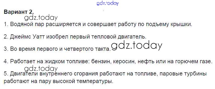Ответы к СР №20. Работа газа и пара при расширении. Двигатель внутреннего сгорания. Паровая турбина Решение к самостоятельным работам вариант-2 Контрольным и самостоятельным работам по Физике для 8 класса Громцева Экзамен УМК 2017