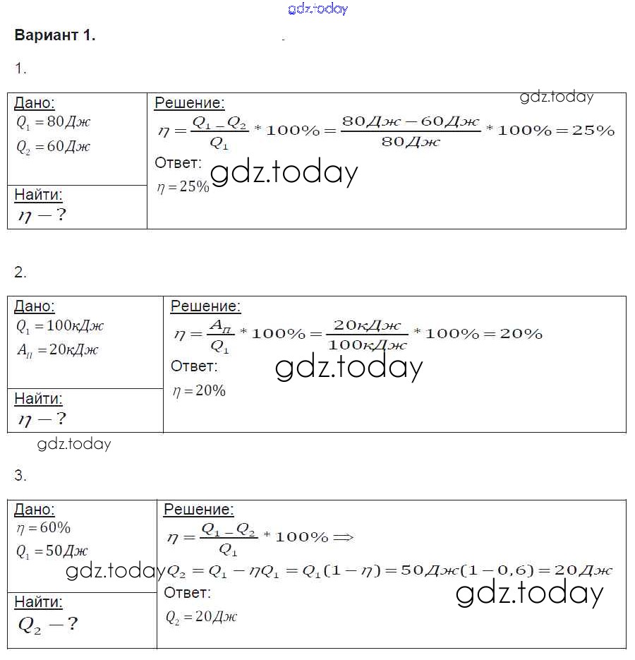 Ответы к СР №21. КПД теплового двигателя Решение к самостоятельным работам вариант-1 Контрольным и самостоятельным работам по Физике для 8 класса Громцева Экзамен УМК 2017