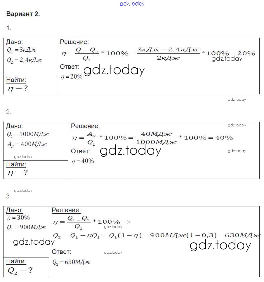 Ответы к СР №21. КПД теплового двигателя Решение к самостоятельным работам вариант-2 Контрольным и самостоятельным работам по Физике для 8 класса Громцева Экзамен УМК 2017