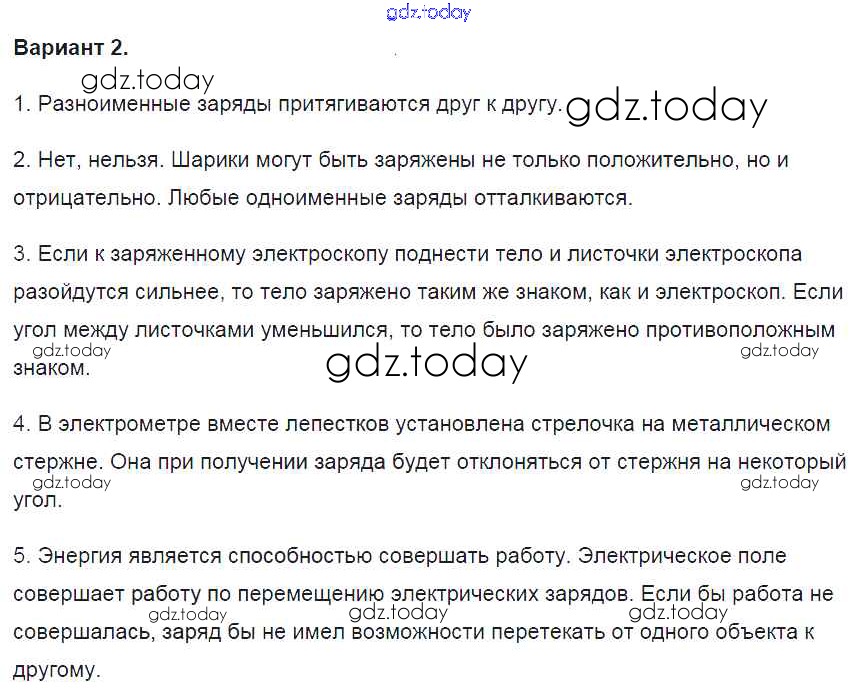 На страницах сайта gdz.today вы найдете учебный и вспомогательный материал, направленный на улучшения знаний школьной программы. ГДЗ - онлайн мир знаний СР №23. Взаимодействие заряженных тел. Электроскоп. Электрическое поле Решение к самостоятельным работам вариант-2 Контрольным и самостоятельным работам по Физике для 8 класса Громцева Экзамен УМК 2017