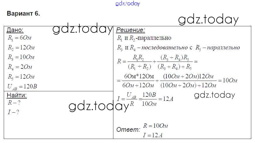 Ответы к СР №35. Последовательное и параллельное соединение проводников. Расчет полного сопротивления и силы тока в цепи Решение к самостоятельным работам вариант-6 Контрольным и самостоятельным работам по Физике для 8 класса Громцева Экзамен УМК 2017