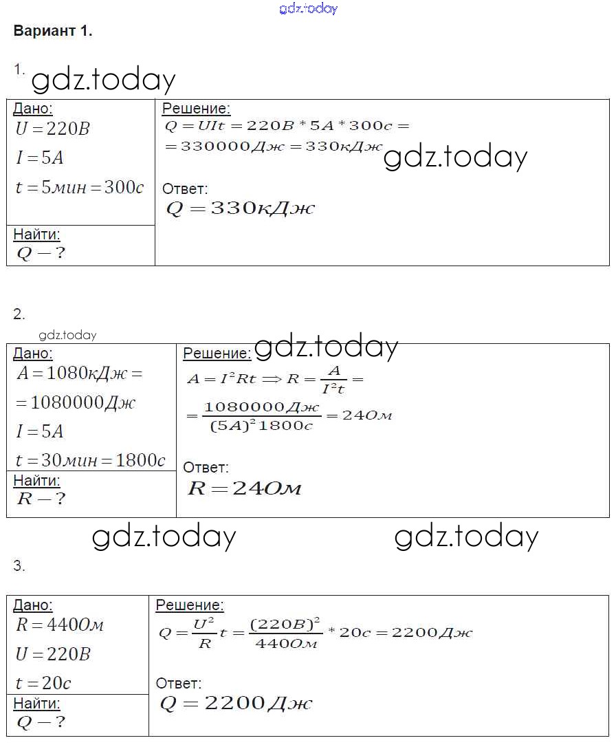 Ответы к СР №38. Нагревание проводников электрическим током. Закон Джоуля-Ленца Решение к самостоятельным работам вариант-1 Контрольным и самостоятельным работам по Физике для 8 класса Громцева Экзамен УМК 2017