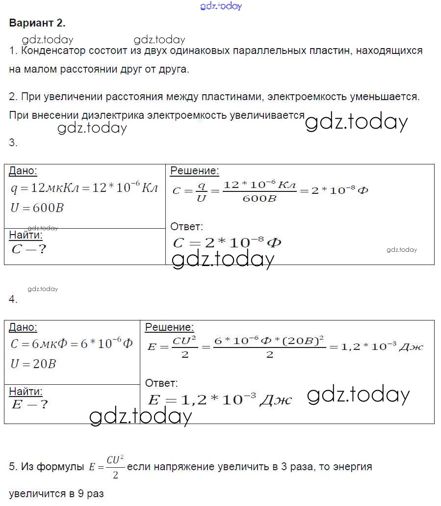 Ответы к СР №39. Конденсатор Решение к самостоятельным работам вариант-2 Контрольным и самостоятельным работам по Физике для 8 класса Громцева Экзамен УМК 2017
