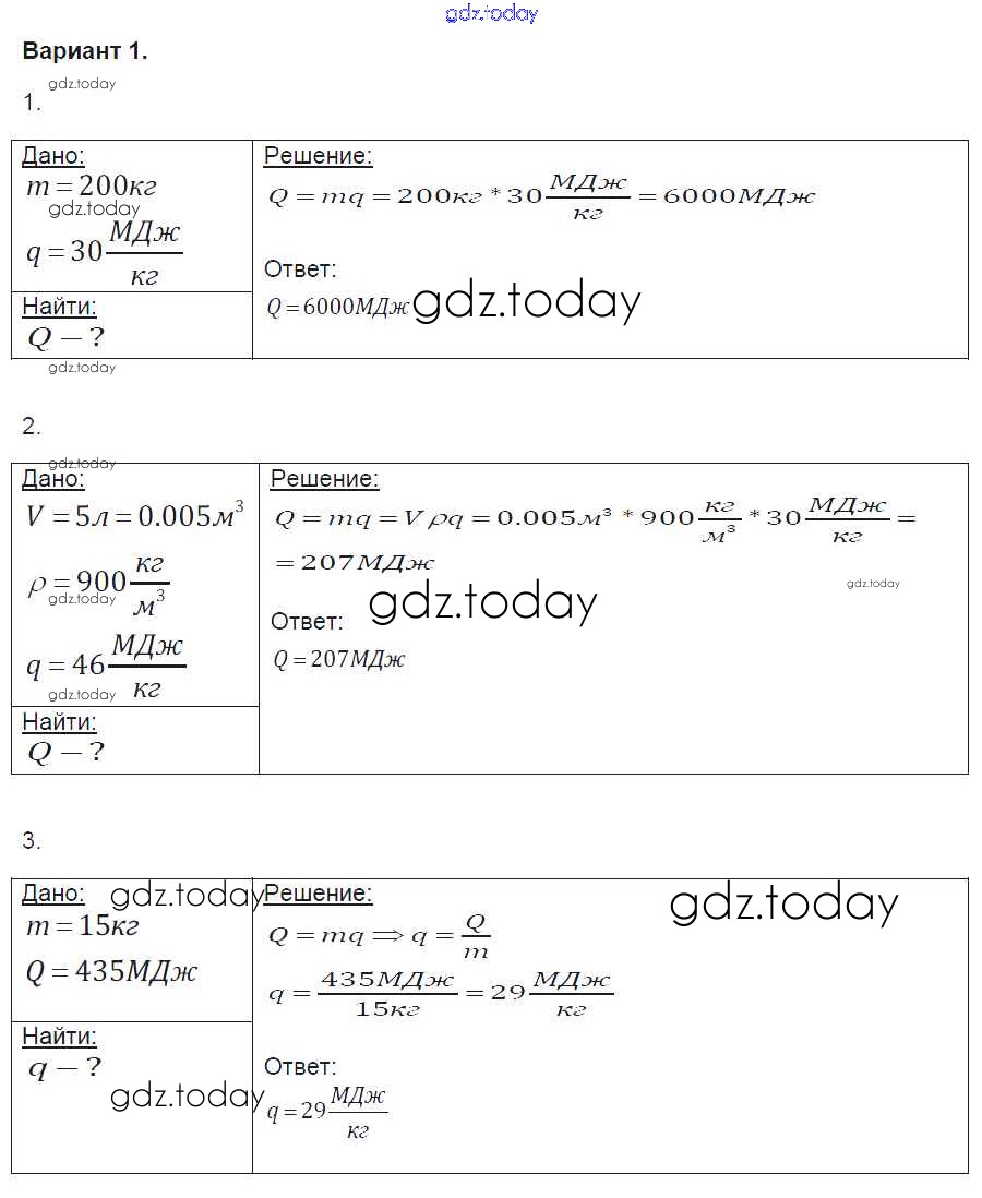 Ответы к СР №8. Энергия топлива. Удельная теплота сгорания Решение к самостоятельным работам вариант-1 Контрольным и самостоятельным работам по Физике для 8 класса Громцева Экзамен УМК 2017