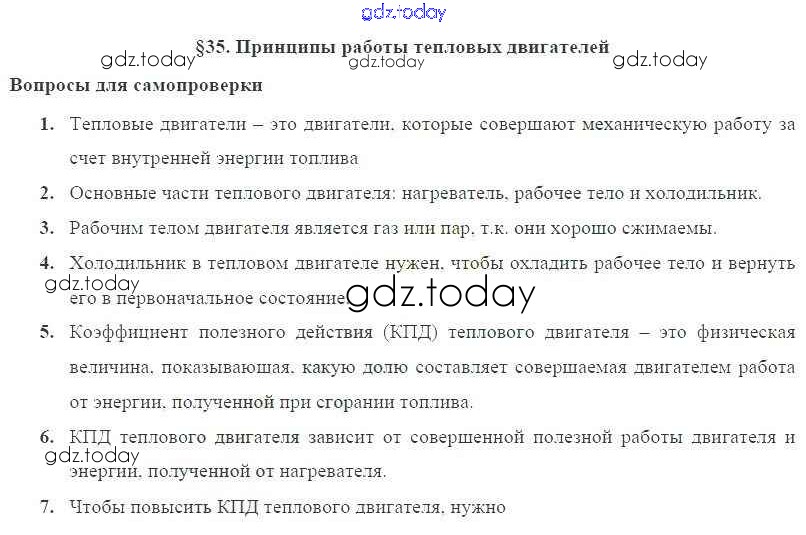На страницах сайта gdz.today вы найдете учебный и вспомогательный материал, направленный на улучшения знаний школьной программы. ГДЗ - онлайн мир знаний Решение к параграфам § 35. Принципы работы тепловых двигателей Учебнику по Физике для 8 класса Пурышева, Важеевская Дрофа Вертикаль 2017