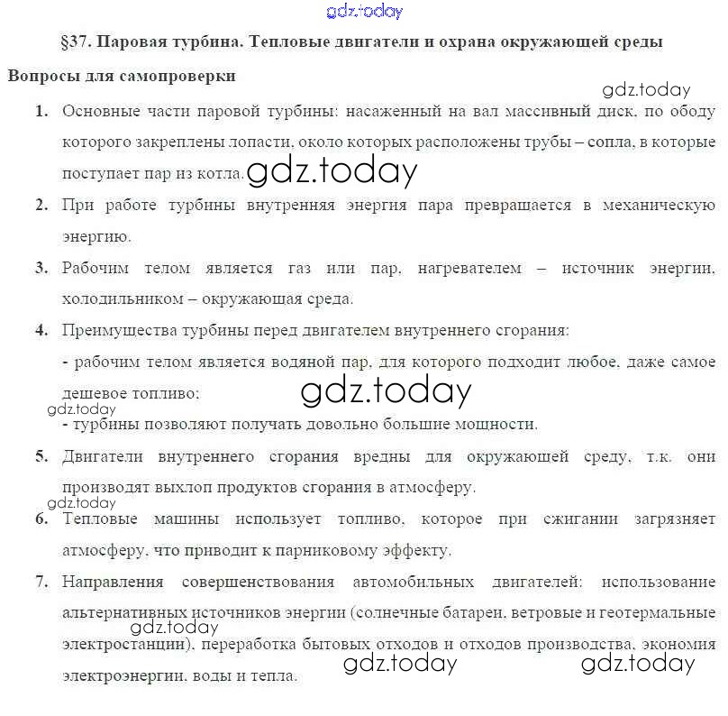 Ответы к Решение к параграфам § 37. Паровая турбина. Тепловые двигатели и охрана окружающей среды Учебнику по Физике для 8 класса Пурышева, Важеевская Дрофа Вертикаль 2017