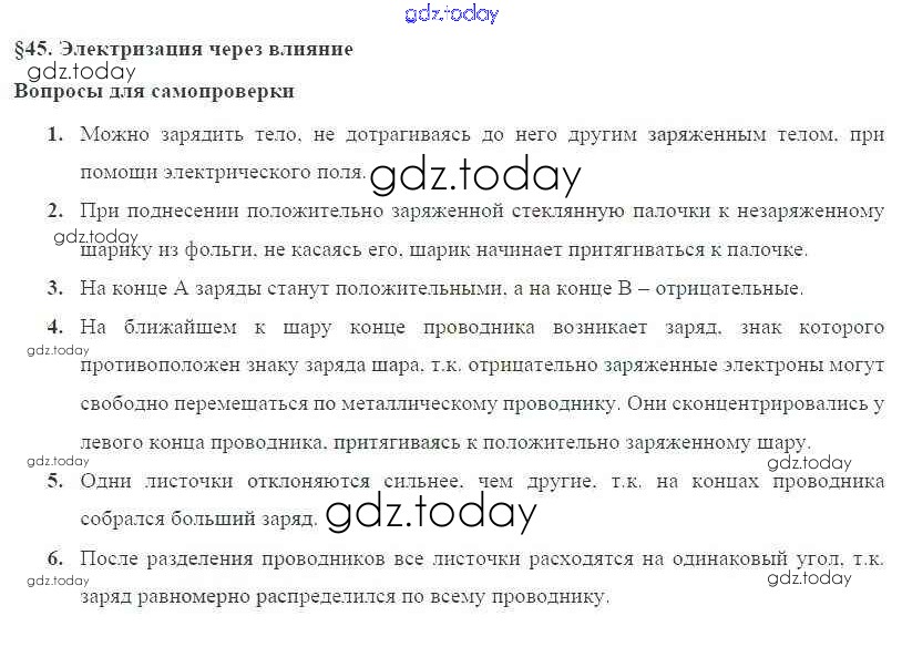 Ответы к Решение к параграфам § 45. Электризация через влияние Учебнику по Физике для 8 класса Пурышева, Важеевская Дрофа Вертикаль 2017