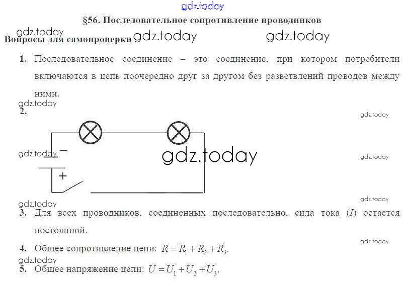 На страницах сайта gdz.today вы найдете учебный и вспомогательный материал, направленный на улучшения знаний школьной программы. ГДЗ - онлайн мир знаний Решение к параграфам § 56. Последовательное сопротивление проводников Учебнику по Физике для 8 класса Пурышева, Важеевская Дрофа Вертикаль 2017
