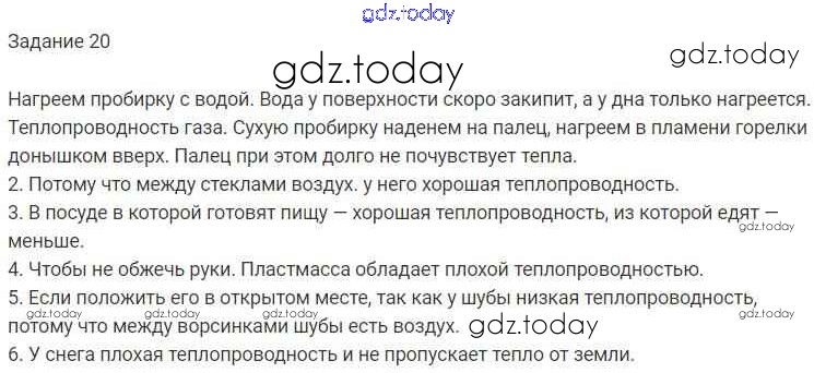 На страницах сайта gdz.today вы найдете учебный и вспомогательный материал, направленный на улучшения знаний школьной программы. ГДЗ - онлайн мир знаний Решение к заданиям № 20 Учебнику по Физике для 8 класса Пурышева, Важеевская Дрофа Вертикаль 2017