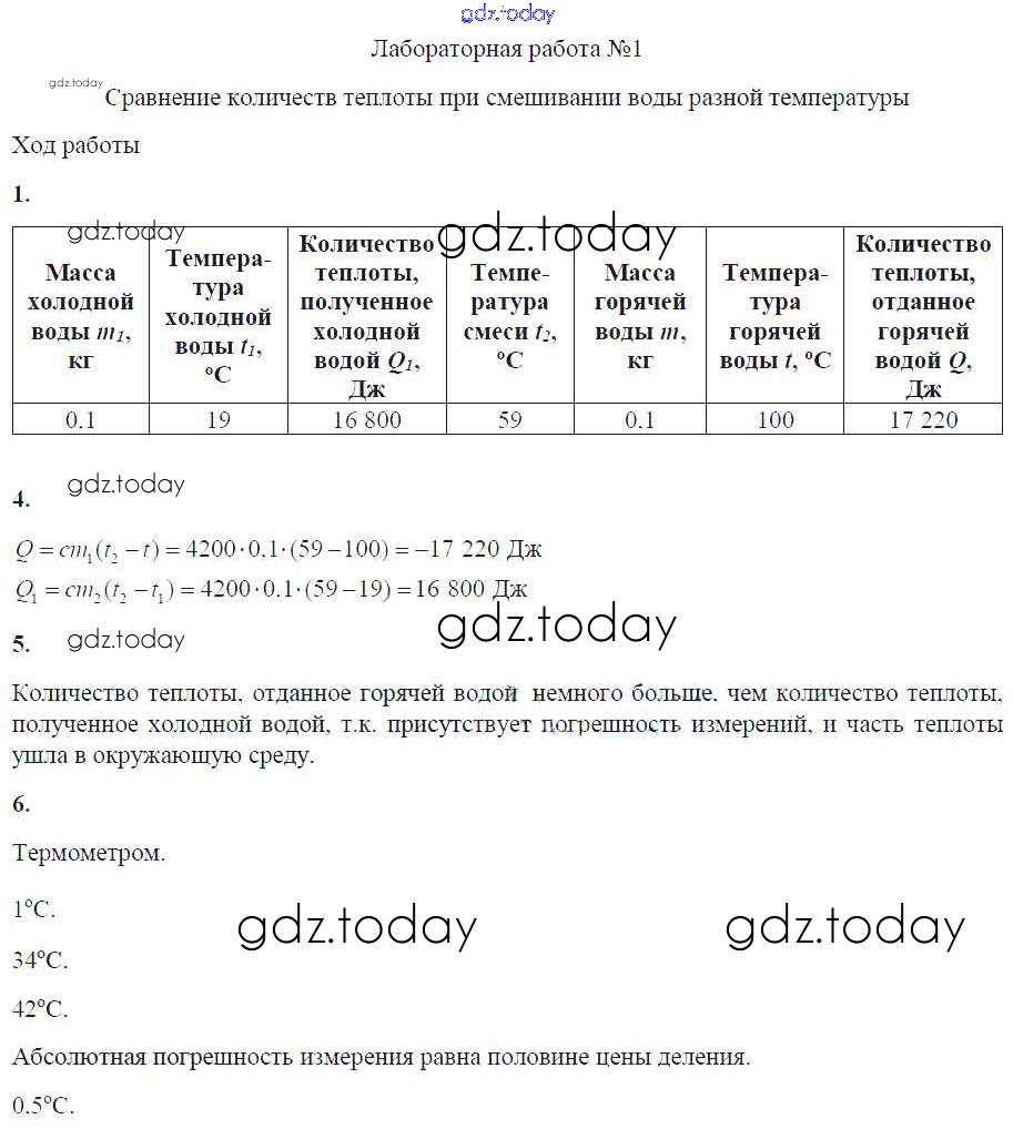 На страницах сайта gdz.today вы найдете учебный и вспомогательный материал, направленный на улучшения знаний школьной программы. ГДЗ - онлайн мир знаний Решение к лабораторным работам ЛР №1. Сравнение количеств теплоты при смешивании воды разной температуры Тетради для лабораторных работ по Физике для 8 класса Минькова, Иванова Экзамен УМК 2014