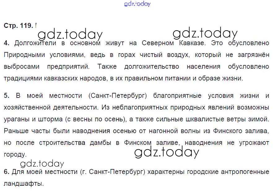 На страницах сайта gdz.today вы найдете учебный и вспомогательный материал, направленный на улучшения знаний школьной программы. ГДЗ - онлайн мир знаний Страницы (решение) 119 Рабочей тетради по Географии для 8 класса Баринова Дрофа УМК 2018
