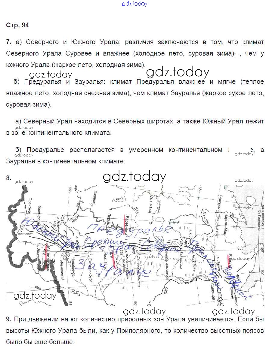На страницах сайта gdz.today вы найдете учебный и вспомогательный материал, направленный на улучшения знаний школьной программы. ГДЗ - онлайн мир знаний Страницы (решение) 94 Рабочей тетради по Географии для 8 класса Баринова Дрофа УМК 2018