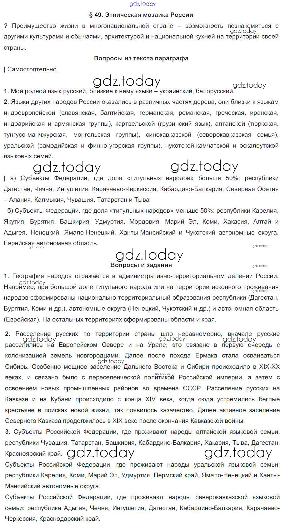 На страницах сайта gdz.today вы найдете учебный и вспомогательный материал, направленный на улучшения знаний школьной программы. ГДЗ - онлайн мир знаний Решение к параграфам 49 Учебнику по Географии для 8 класса Алексеев Дрофа УМК 2018