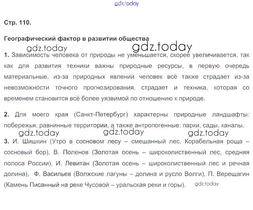 На страницах сайта gdz.today вы найдете учебный и вспомогательный материал, направленный на улучшения знаний школьной программы. ГДЗ - онлайн мир знаний Страницы (решение) 110 Рабочей тетради по Географии для 8 класса Баринова, Дронов Дрофа УМК 2017