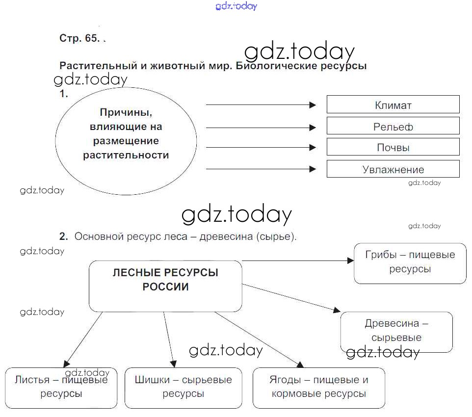 На страницах сайта gdz.today вы найдете учебный и вспомогательный материал, направленный на улучшения знаний школьной программы. ГДЗ - онлайн мир знаний Страницы (решение) 65 Рабочей тетради по Географии для 8 класса Баринова, Дронов Дрофа УМК 2017
