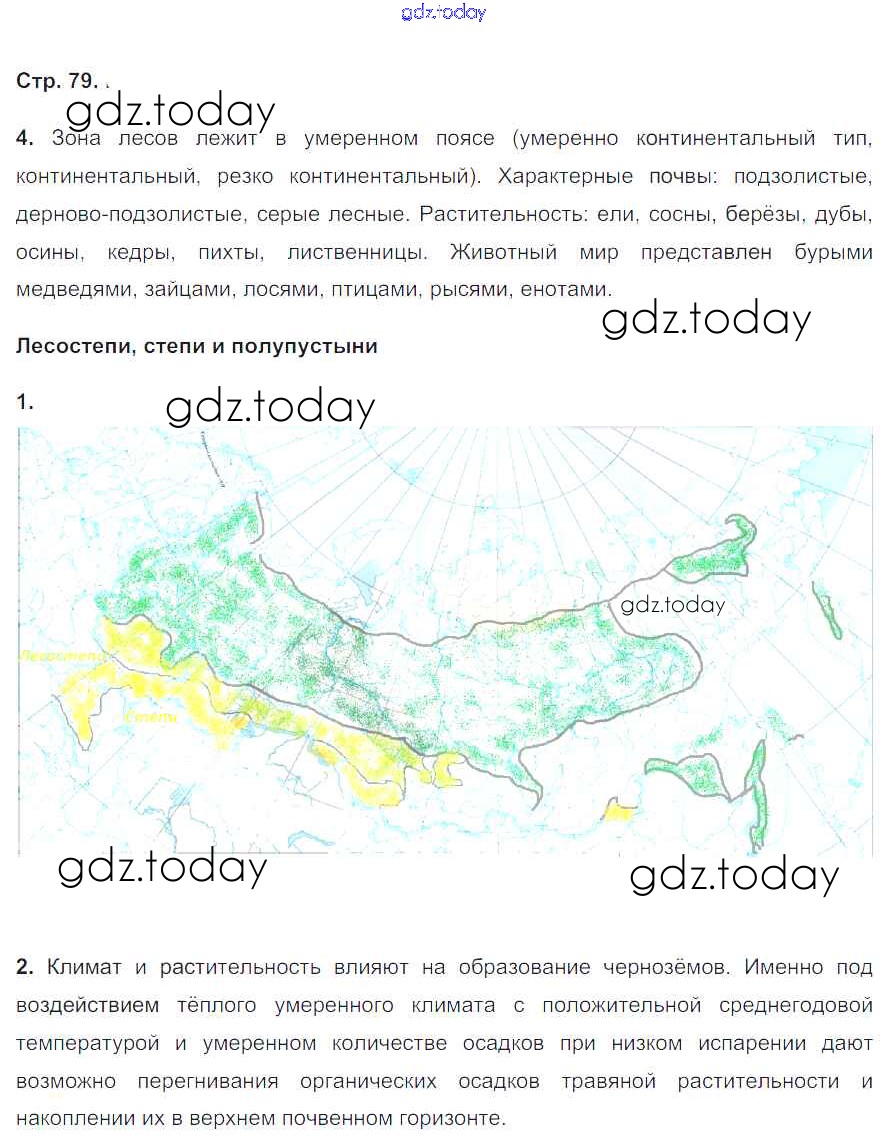 На страницах сайта gdz.today вы найдете учебный и вспомогательный материал, направленный на улучшения знаний школьной программы. ГДЗ - онлайн мир знаний Страницы (решение) 79 Рабочей тетради по Географии для 8 класса Баринова, Дронов Дрофа УМК 2017