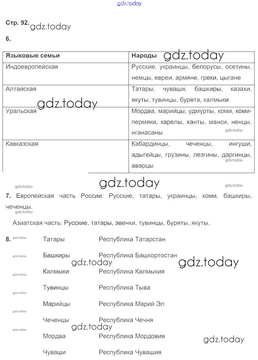 На страницах сайта gdz.today вы найдете учебный и вспомогательный материал, направленный на улучшения знаний школьной программы. ГДЗ - онлайн мир знаний Страницы (решение) 92 Рабочей тетради по Географии для 8 класса Баринова, Дронов Дрофа УМК 2017