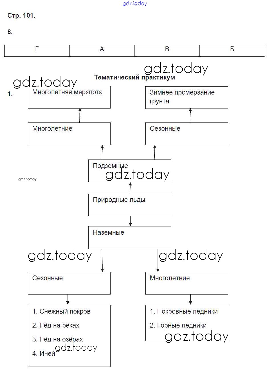 На страницах сайта gdz.today вы найдете учебный и вспомогательный материал, направленный на улучшения знаний школьной программы. ГДЗ - онлайн мир знаний Решение к части 1. Страницы 101 Рабочей тетради по Географии для 8 класса Домогацких Русское слово Инновационная школа 2017