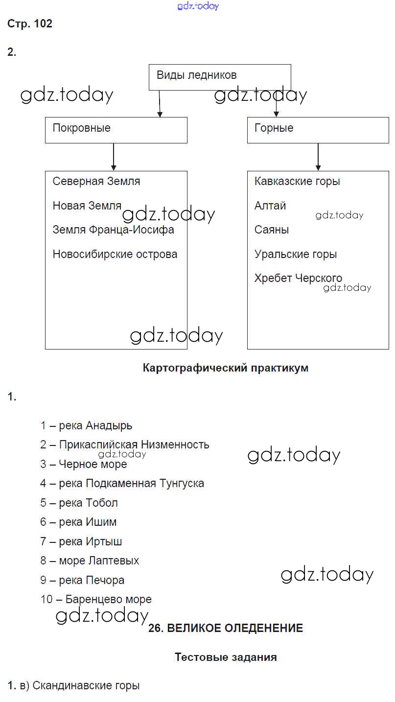 На страницах сайта gdz.today вы найдете учебный и вспомогательный материал, направленный на улучшения знаний школьной программы. ГДЗ - онлайн мир знаний Решение к части 1. Страницы 102 Рабочей тетради по Географии для 8 класса Домогацких Русское слово Инновационная школа 2017