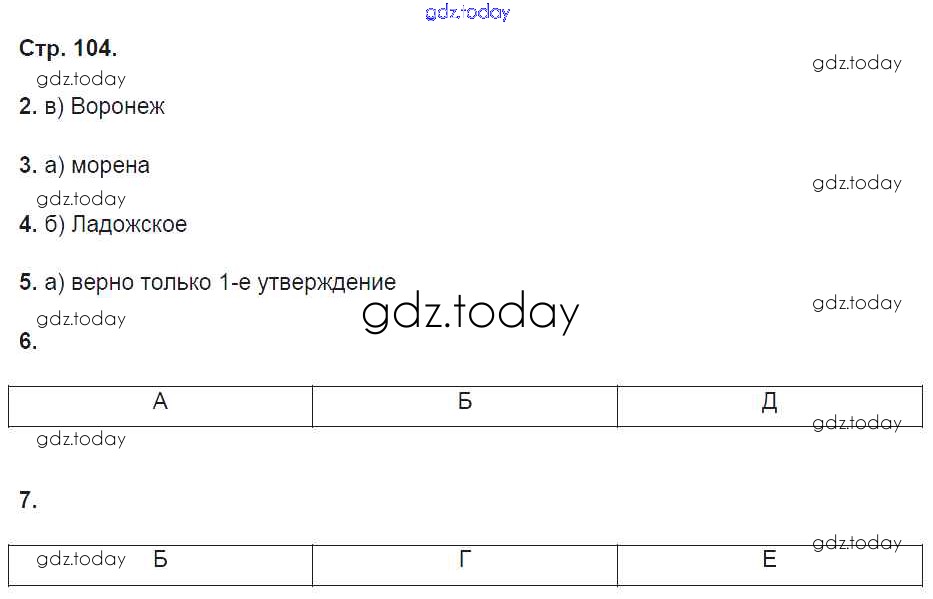 На страницах сайта gdz.today вы найдете учебный и вспомогательный материал, направленный на улучшения знаний школьной программы. ГДЗ - онлайн мир знаний Решение к части 1. Страницы 104 Рабочей тетради по Географии для 8 класса Домогацких Русское слово Инновационная школа 2017