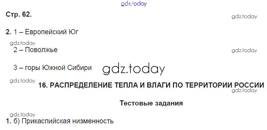 На страницах сайта gdz.today вы найдете учебный и вспомогательный материал, направленный на улучшения знаний школьной программы. ГДЗ - онлайн мир знаний Решение к части 1. Страницы 62 Рабочей тетради по Географии для 8 класса Домогацких Русское слово Инновационная школа 2017