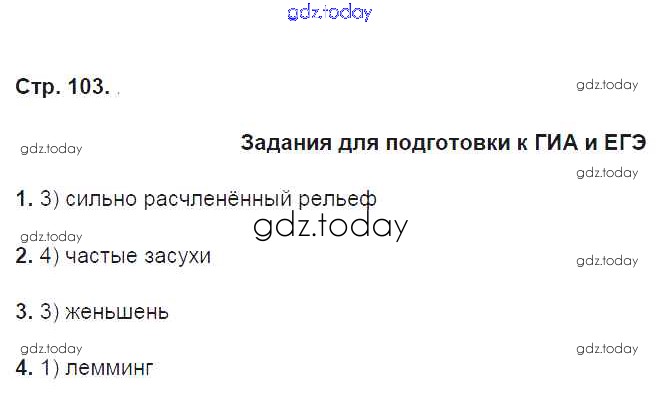 На страницах сайта gdz.today вы найдете учебный и вспомогательный материал, направленный на улучшения знаний школьной программы. ГДЗ - онлайн мир знаний Страницы (решение) 103 Рабочей тетради по Географии для 8 класса Ким, Марченко Дрофа УМК 2016
