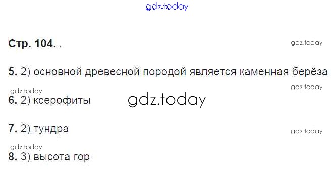 На страницах сайта gdz.today вы найдете учебный и вспомогательный материал, направленный на улучшения знаний школьной программы. ГДЗ - онлайн мир знаний Страницы (решение) 104 Рабочей тетради по Географии для 8 класса Ким, Марченко Дрофа УМК 2016