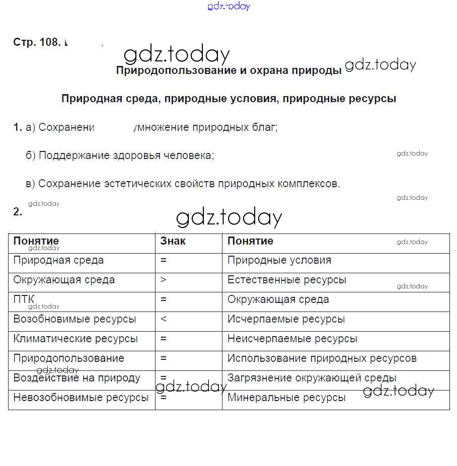 На страницах сайта gdz.today вы найдете учебный и вспомогательный материал, направленный на улучшения знаний школьной программы. ГДЗ - онлайн мир знаний Страницы (решение) 108 Рабочей тетради по Географии для 8 класса Ким, Марченко Дрофа УМК 2016