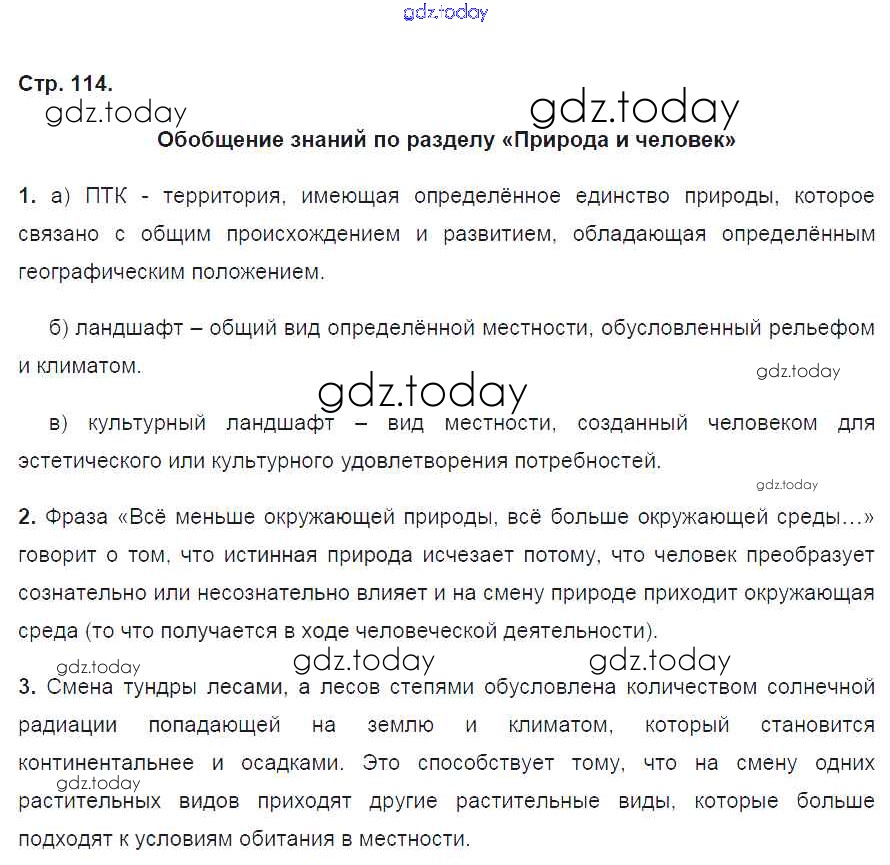На страницах сайта gdz.today вы найдете учебный и вспомогательный материал, направленный на улучшения знаний школьной программы. ГДЗ - онлайн мир знаний Страницы (решение) 114 Рабочей тетради по Географии для 8 класса Ким, Марченко Дрофа УМК 2016